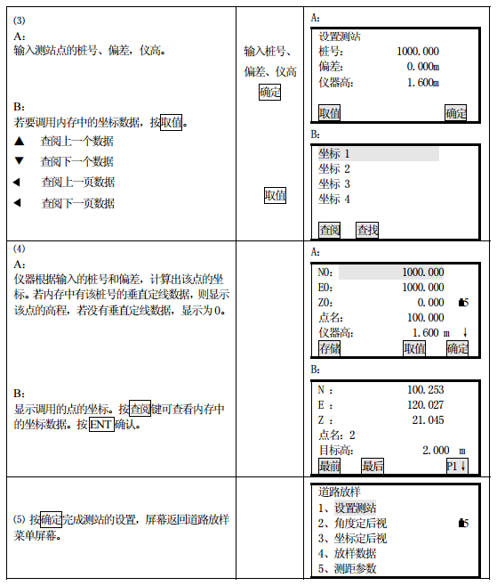 測站的設置可以通過鍵盤或從儀器內存讀取的方式輸入。鍵盤輸入是按“樁號、偏差” 的形式輸入的,而從內存中讀取的是 N、E、Z 坐標形式。
